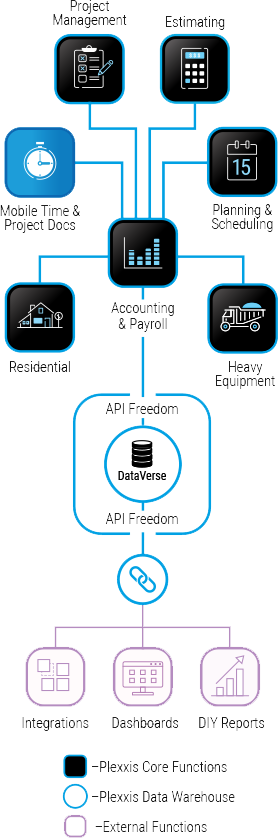 –Plexxis Core Functions –Plexxis Data Warehouse –External Functions API Freedom API Freedom Accounting& Payroll DIY Reports Dashboards Integrations DataVerse HeavyEquipment Mobile Time & Project Docs ProjectManagement Residential Estimating Planning &Scheduling