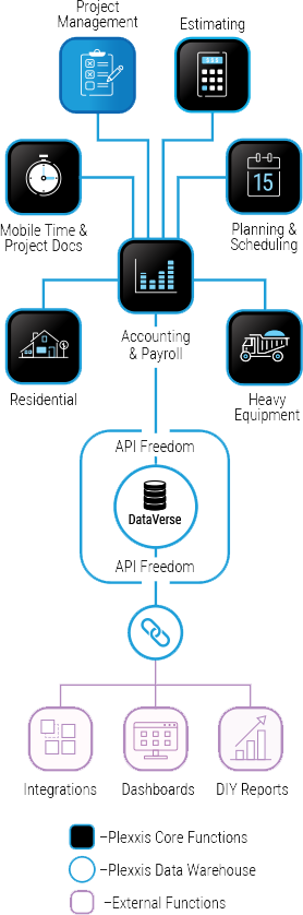 –Plexxis Core Functions –Plexxis Data Warehouse –External Functions API Freedom API Freedom Accounting& Payroll DIY Reports Dashboards Integrations DataVerse Mobile Time & Project Docs Estimating Planning &Scheduling HeavyEquipment Accounting& Payroll ProjectManagement Residential