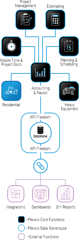 –Plexxis Core Functions –Plexxis Data Warehouse –External Functions API Freedom API Freedom Accounting& Payroll DIY Reports Dashboards Integrations DataVerse Mobile Time & Project Docs Residential Estimating Planning &Scheduling HeavyEquipment Accounting& Payroll ProjectManagement